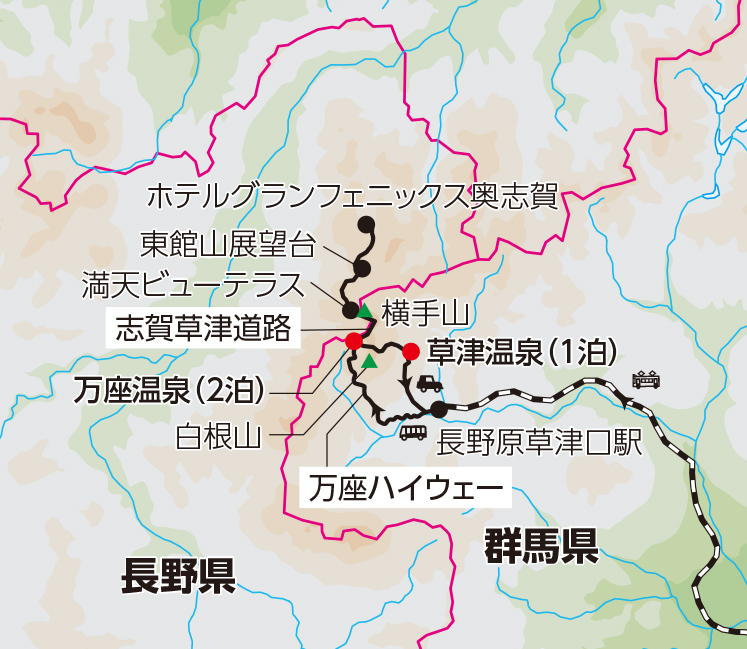 万座温泉09:00発 (万座高原) (志賀高原) (横手山展望台) (東館山展望台) 草津温泉16:00着