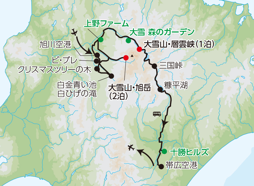 (黒岳ロープウェイ) 大雪山・層雲峡10:00発 (三国峠) (糠平湖) (十勝ヒルズ) 帯広空港16:10発 羽田空港17:55着