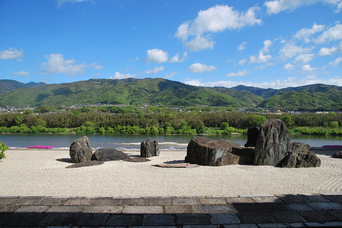 四国の中央部を東西に貫く四国山地には、剣山をはじめ、古くから山岳信仰の霊峰とされてきた山々が連なります。本楽寺は、その四国山地に寄り添うように流れる吉野川の中流域、徳島県美馬市に佇む真言宗御室派の寺院です。日本で唯一、川を借景とした石庭を有する寺として知られ、枯山水の石庭と回遊式庭園は作庭家・齋藤忠一の手によるものです。緑と岩肌が織りなす景観は美しく、四国八十八景のひとつにも選ばれています。