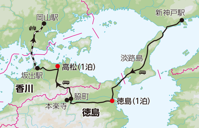 新神戸駅12:00集合 淡路島 徳島17:30発 鳴門23:00着