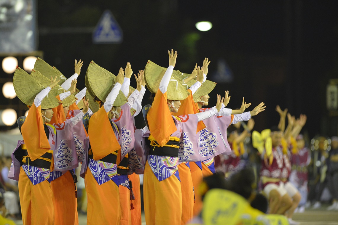約400年の歴史を持つ「阿波おどり」は、蜂須賀家政による徳島城築城の祝いの席で、人々が無礼講で踊ったのが起源とされています。盆踊り(念仏踊り)をもとに、庶民が自由に楽しむ踊りとして阿波の国一帯に広まりました。鳴門の阿波おどりは県内でも先陣を切って開催されるため、待ちわびた人々の熱気に満ち、踊り手と観客の距離が近いことから臨場感もひとしおです。歴史ある各地の「連」が桟敷席の前を次々と踊り進む様子を間近にご覧いただけるほか、飛び入り参加できる「にわか連」では観客も一緒に踊りの輪に加われます。